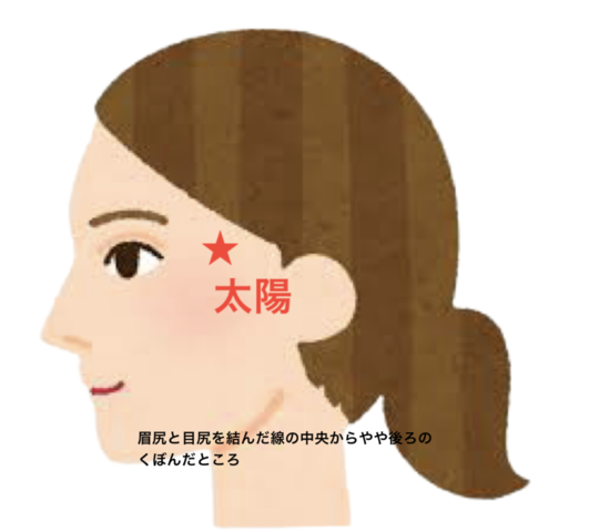 太陽はこめかみ付近にあるツボで、眼精疲労に効果を発揮するツボです。かすみ目や疲れ目などの症状がある時に押すと、症状の改善が期待できるのです。