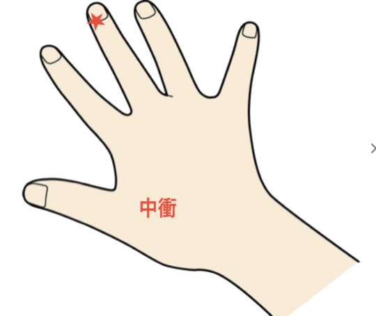 中衝は、手の中指にあるツボで、爪の生え際の親指に寄ったところにあります。