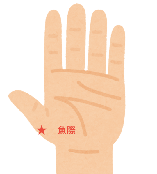 魚際は、消化器や呼吸器を通る肺経のツボです。特に、風邪で咳をしている時に効果的だと言われています。