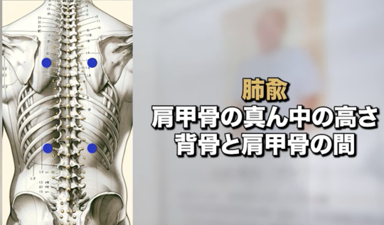 肺兪は、背骨と肩甲骨の間の2分の1の部分で、肩甲骨の高さ2分の1の部分にあります。