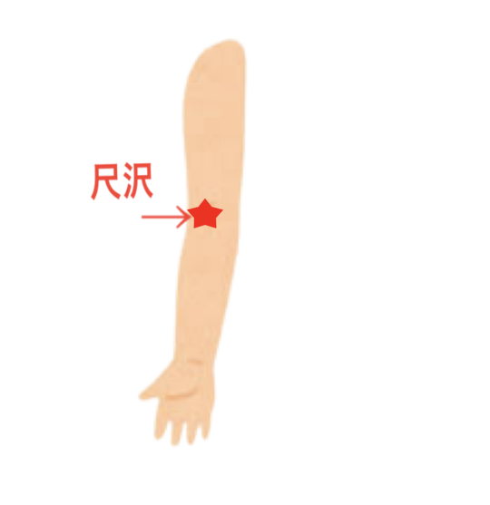 尺沢は、肘を曲げた時に出来る内側のシワの上にシワの中央から指約2本分親指側に進んだ場所にあるかたい腱の外側にあります。