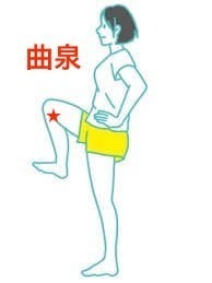 曲泉は、膝を曲げた時に膝の裏にできるしわの一番内側の場所にあります。