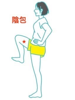 陰包は、膝の内側に触れる大きな骨の上に向かって指5本上がった場所にあります。膝蓋骨の内側に骨の突出するふくらみから約10cm上にあります。