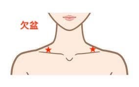 欠盆は、乳首のライン上にあるツボです。鎖骨中央のすぐ上の大きくへこんでいる場所にあります。