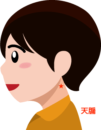 天牖は、耳たぶの裏側にある出っ張った骨の後ろ斜め下で顎の角張った部位の高さ上のラインにあるツボです。