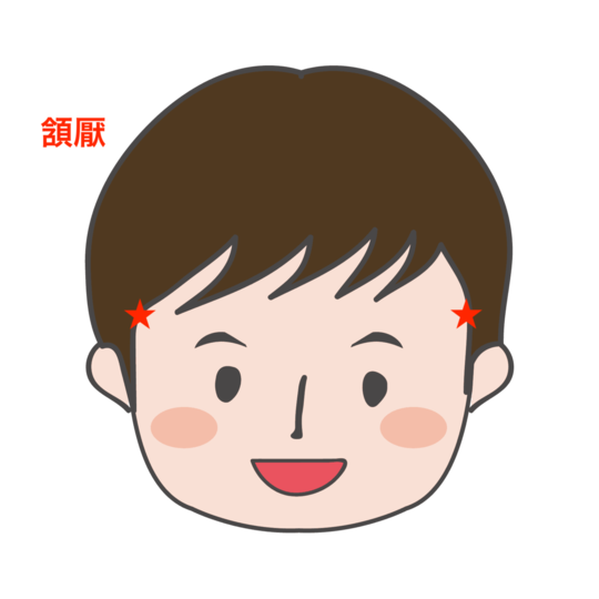 頷厭の場所は、額の髪の生え際から耳の先端に向かって親指1本ほど先に進んだ場所です。口を開けたり閉めたりしたときに動きを感じることができる場所にあります。