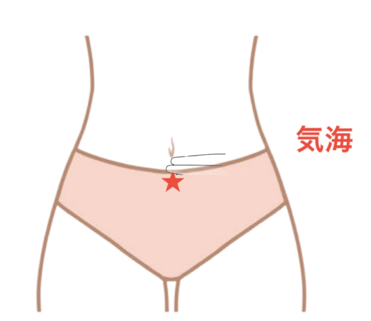 気海は、体の真ん中のラインで臍から指2本分下にあるツボです。