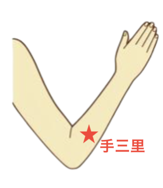 手三里は、肘を曲げた時にできるしわに人さし指をおいて手首側に向かって指3本分進んだ場所にあります。
