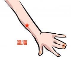 温溜は、手の甲側にあるツボです。手首の親指側の端と肘を曲げた時にできるしわの外端を結んだラインの中央にあります。