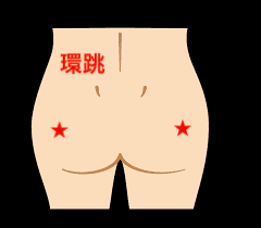 環跳は、お尻のやや外側にあるツボで、お尻の外側の力を入れるとえくぼができる場所にあります。