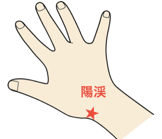 陽渓は、親指側の手首の付け根にあります。親指を広げると2本の筋が出てきます。このくぼみの部分にあるのです。