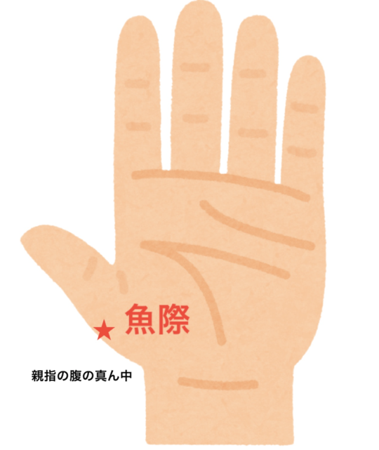 魚際は呼吸器を通っている肺経のツボで、風邪で咳をしている時にもオススメのツボです。他にも、イライラしている時や興奮している時などにも効果的です。