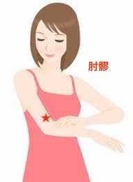 肘髎は、肘を完全に曲げたときに肘の内側にできるシワの一番外側から肩に向かって親指の幅1本分上にあります。