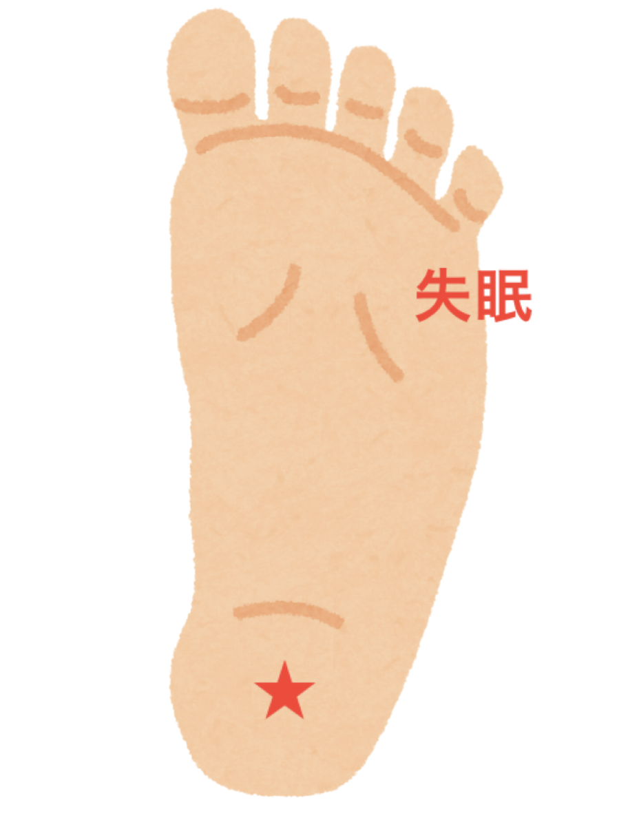 失眠は、足の裏側にあるツボです。かかとの中央の少しへこんだ場所にあります。