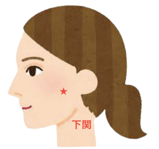 下関は、耳たぶの付け根から指4本開けた所にあるほほのくぼんでいる場所にあります。探す時には、口を開けると骨が持ち上がる場所を意識して探しましょう。