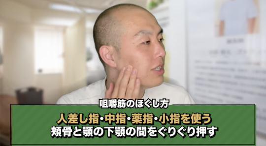 ほぐし方も簡単です。人差し指、中指、薬指、小指を使って頬骨と顎の下顎の間をぐりぐり押します。垂直に押すのではなく削り取るように押しましょう。満遍なく押すことがポイントです。