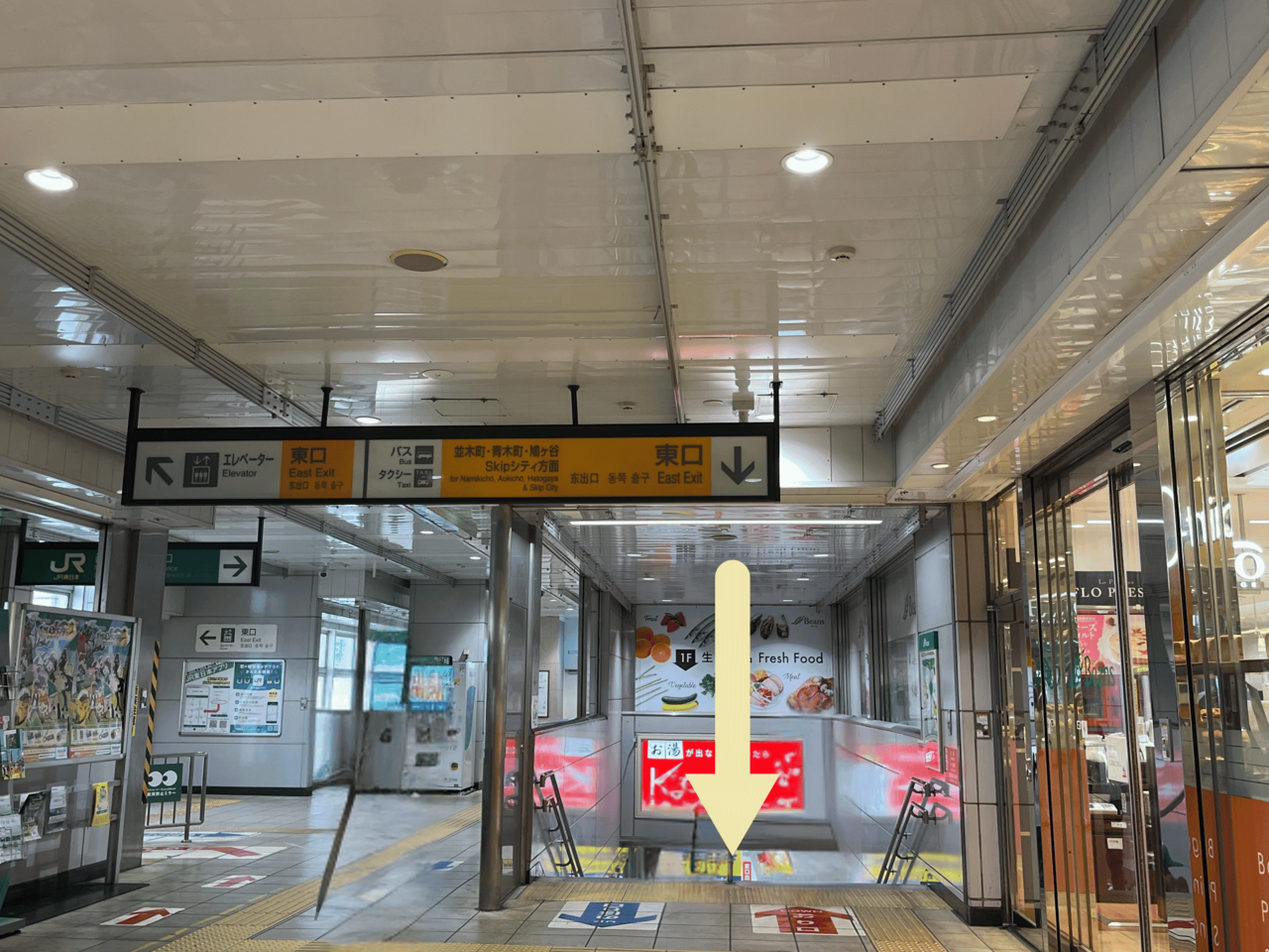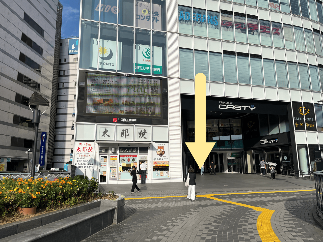 川口駅東口を出ると、目の前に太郎焼とキャスティが見えます。キャスティのエスカレーターを降ります。