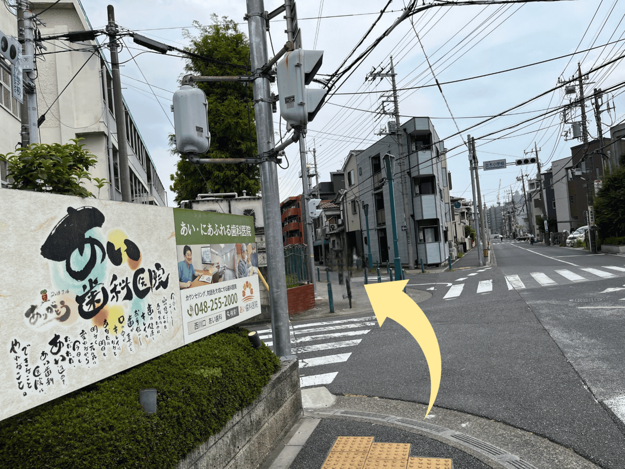 右手にタイ料理屋さんがある信号のない横断歩道を渡り、真っすぐ進み、コインランドリーを右手にもう少し進むと、左手に「あい歯科医院」があるので、その信号を渡ります。