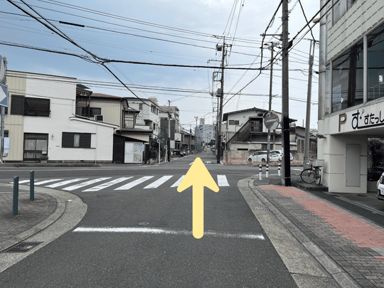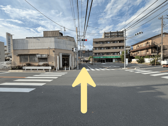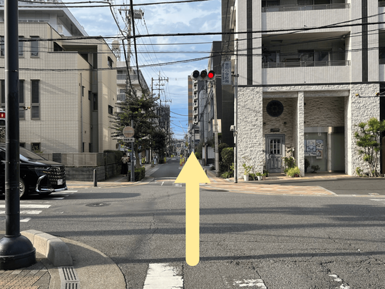 右手にタイ料理屋さんがある信号のない横断歩道を渡り、真っすぐ進み、コインランドリーを右手にもう少し進むと、左手に「あい歯科医院」があるので、その信号を渡ります。
