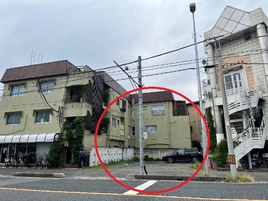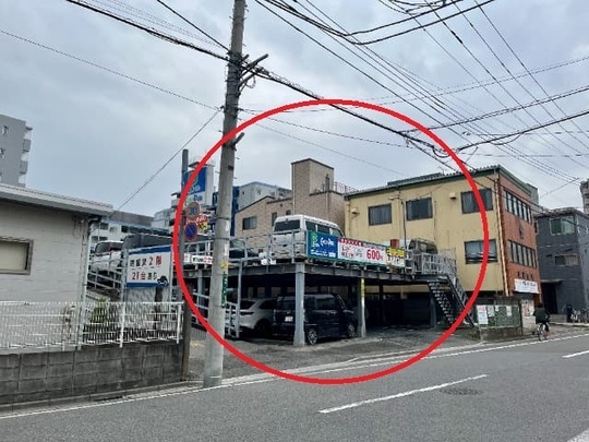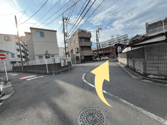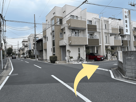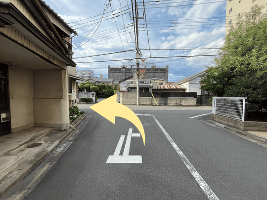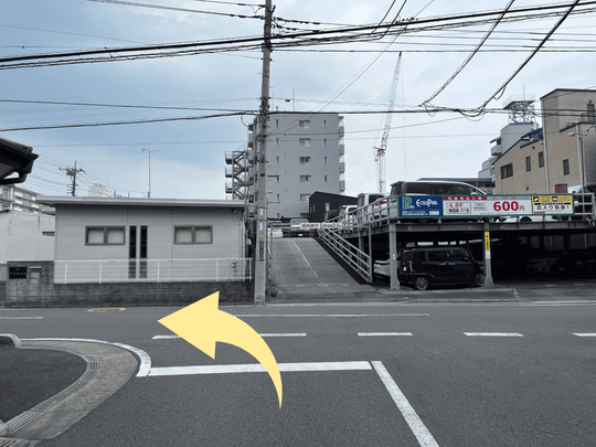住宅街を進み、コインパーキングが見えたら左に曲がります。