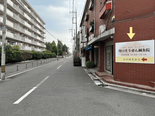 当院から50mほど先にあるホワイト急便(クリーニング屋)を過ぎて突き当りを左に曲がるとあります