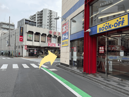 西川口東口を出ると、すぐマクドナルドが見えます。マクドナルドを右手に、BOOKOFFの方に向かってください。