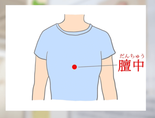壇中は胸の真ん中にあります。左右の乳首を結ぶ線の真ん中で、胸と乳首の位置を把握して結んだ線の真ん中にあります。反応がある人は軽く押すだけでも痛いです。場所がわかりにくい人は一帯を押してみて痛い場所で良いです。