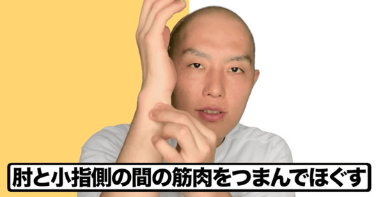肘と小指の間の筋肉を摘んでほぐしましょう。筋肉をぐりぐりするのではなく皮膚と筋肉の間をつまみます。あまりぐりぐりすると神経が圧迫されているところから圧迫が強くなり悪くなってしまうことがあるため、皮膚を伸ばすイメージで行います。