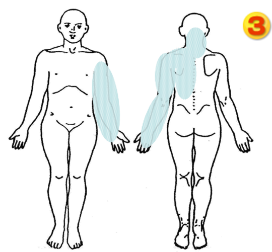 この4つの筋肉のうち、2つ以上かたまることで、腕、肩甲骨に痛み、しびれが強く感じるようになります。このパターンは、肩が動かしにくくなったりすることがあります。回旋腱板からくる頚肩腕症候群も鍼灸は有効です。